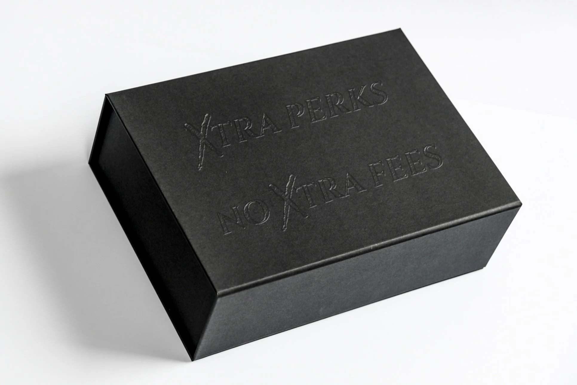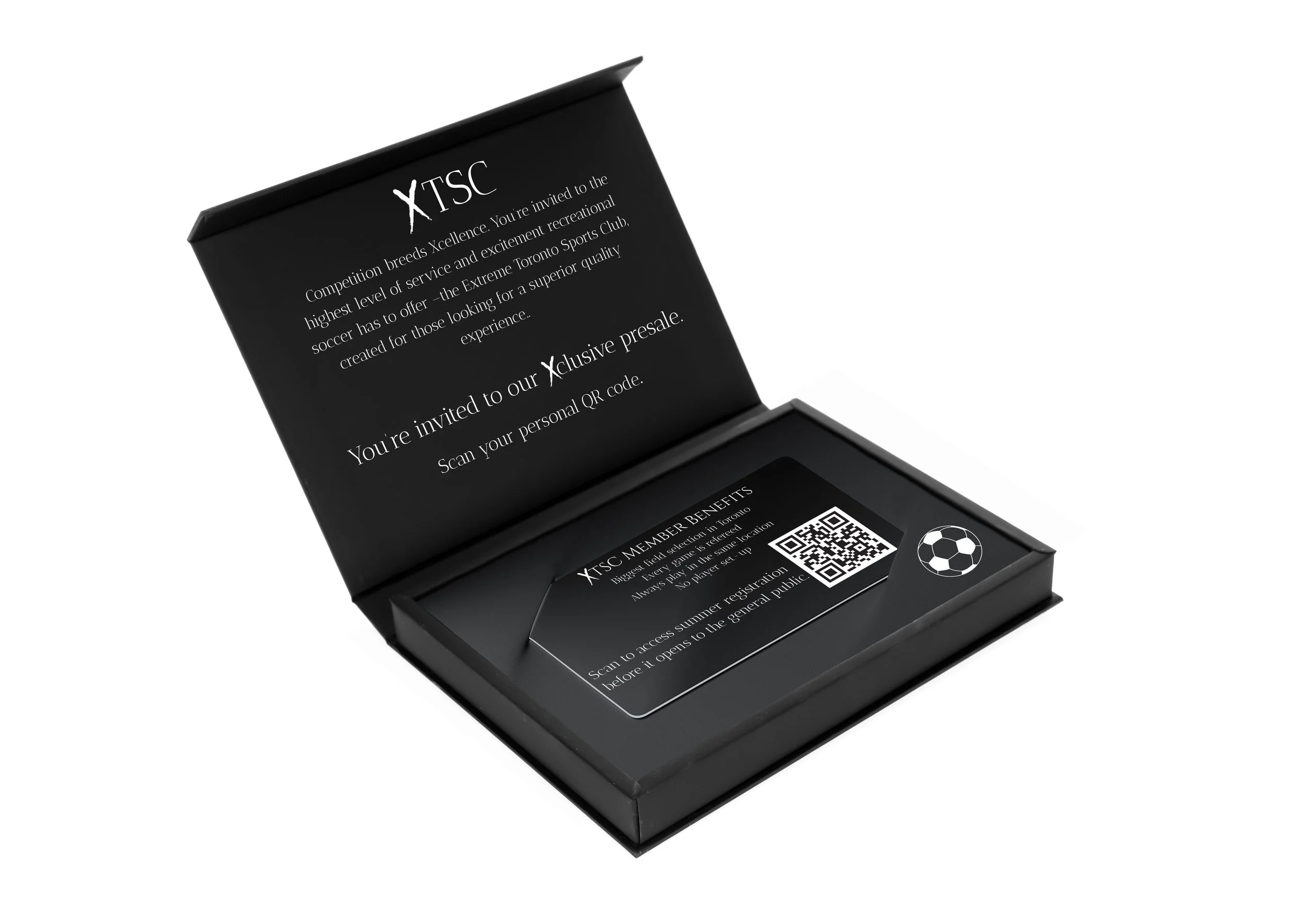The offer parodies a black credit card invitation. The card inside has a QR code to scan for access to exclusive early registration for all XTSC soccer leagues.